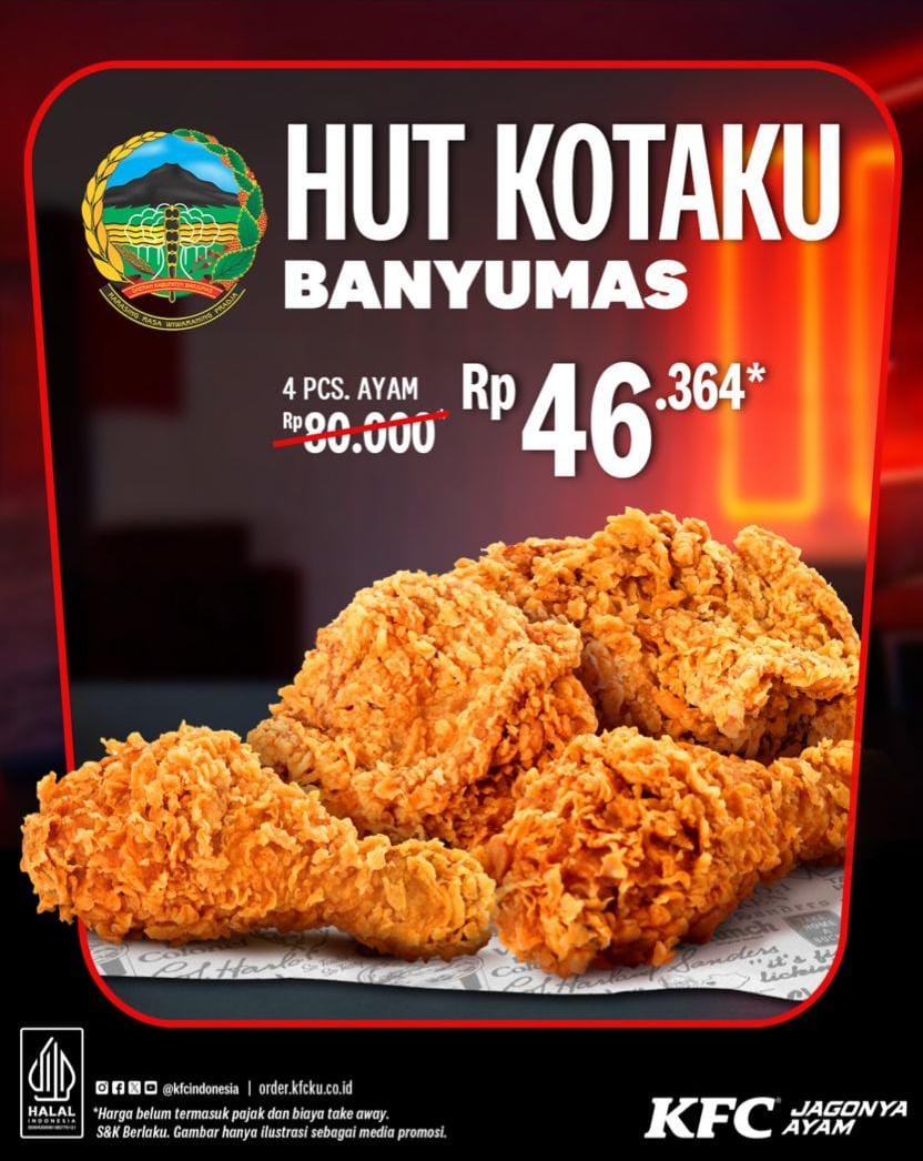 Lintas24jam.com – Dalam rangka peringatan hari jadi kabupaten Banyumas yang ke-455, KFC Kota Banyumas menyediakan promo spesial 21-23 Februari 2026.