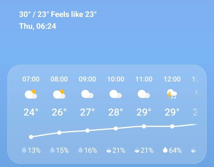 Pada pagi hingga menjelang siang hari, cuaca diprediksi cerah berawan. Sinar matahari masih dapat menembus lapisan awan tipis, sehingga aktivitas seperti bekerja, sekolah, maupun kegiatan olahraga luar ruangan dapat berjalan lancar. Suhu udara cenderung terasa hangat dengan tingkat kelembapan yang masih dalam batas normal.