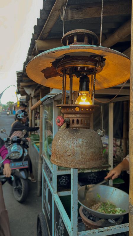 Bangunan kaki lima dengan atap bambu menjadi ciri khas utama. Ditambah lagi dengan meja dan kursi jadul yang sederhana, serta penataan tempat makan yang dibuat menyerupai lorong kota lama, menciptakan pengalaman kuliner yang tidak sekadar makan, tetapi juga menikmati atmosfer klasik yang hangat.