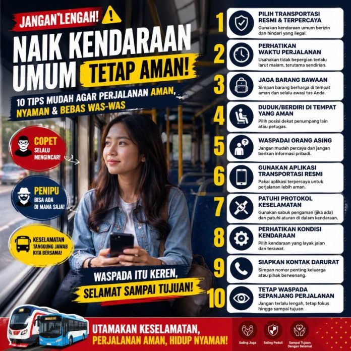 Lintas24jam.com – Bepergian menggunakan kendaraan umum seperti bus kota, kereta api, atau angkot menjadi pilihan banyak orang karena praktis dan ekonomis. Namun, faktor keselamatan tetap harus menjadi prioritas utama. Berikut beberapa tips penting agar perjalanan Anda tetap aman dan nyaman.
